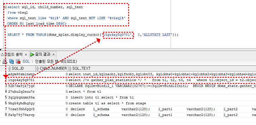 옵티마이저가 실행계획을 생성할 때 관련된 SQL의 통계정보가 있는지 조회하고 있으면 그 통계정보를 보고 실행계획을 생성합니다