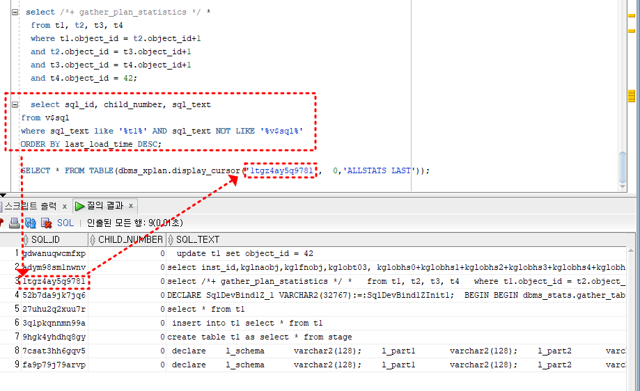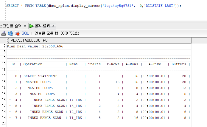 SELECT * FROM TABLE(dbms_xplan.display_cursor('1tgz4ay5q9781', 2,'ALLSTATS LAST'));