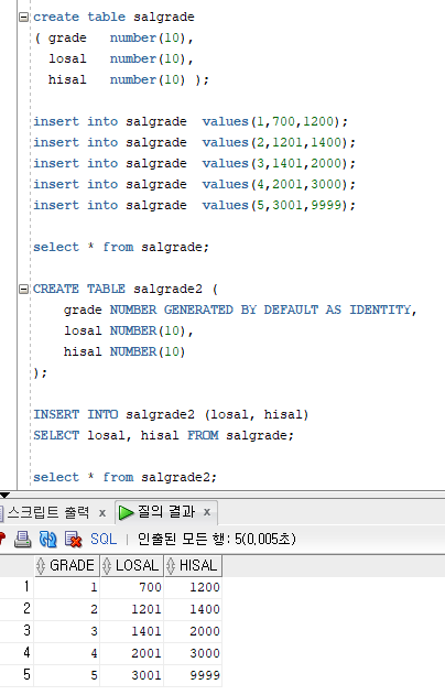 문제3. salgrade 테이블과 똑같은 테이블을 salgrade2로 생성하는데 만들때부터 grade 컬럼을 identity 컬럼으로 생성하는데 데이터를 입력될 수 있게해서 grade컬럼의 값이 자동증가되게 하세요