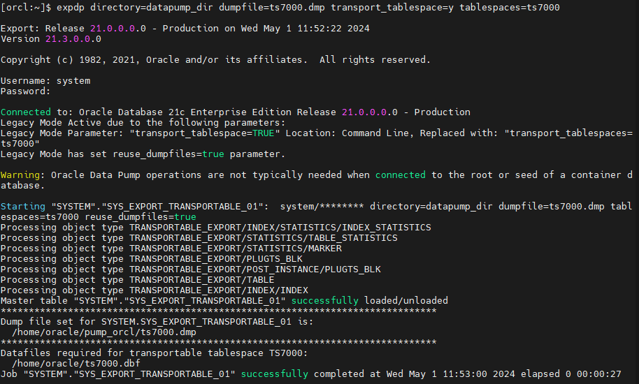 expdp directory=datapump_dir dumpfile=ts7000.dmp transport_tablespace=y tablespaces=ts7000