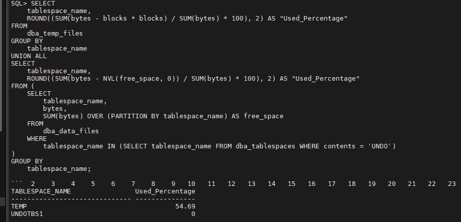 ROUND((SUM(bytes - NVL(free_space, 0)) / SUM(bytes) * 100), 2) AS \"Used_Percentage\"