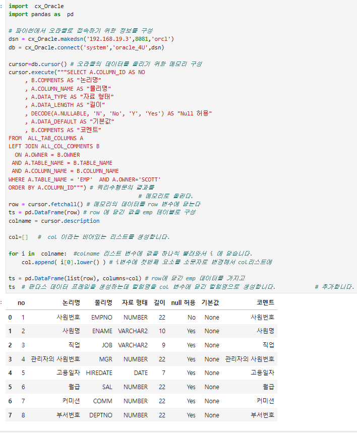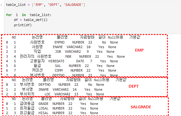 emp 테이블의 정의서를 출력하는 파이썬코드