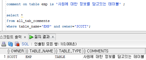 comment on table emp is '사원에 대한 정보를 담고있는 테이블' ;