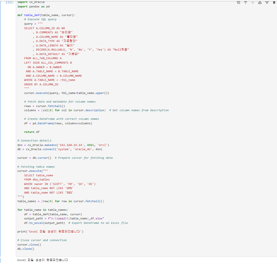 오라클과 연동하는 파이썬코드를 쥬피터에서 실행합니다.